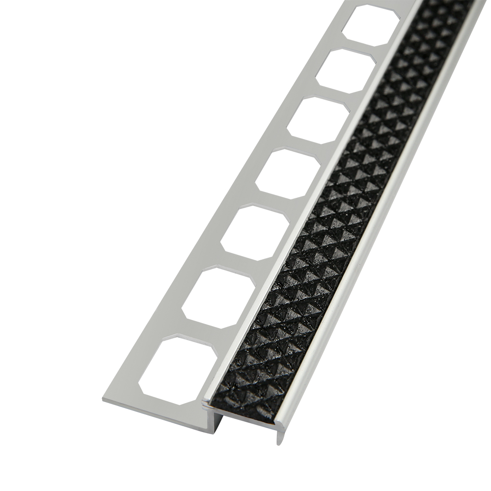 Transformeer uw tegelproject met het DeMa Tools trapprofiel aluminium zilver geanodiseerd met antislip veiligheidsinzet r9, zichtbare breedte 17 mm, inlegbreedte 13 mm zwart.